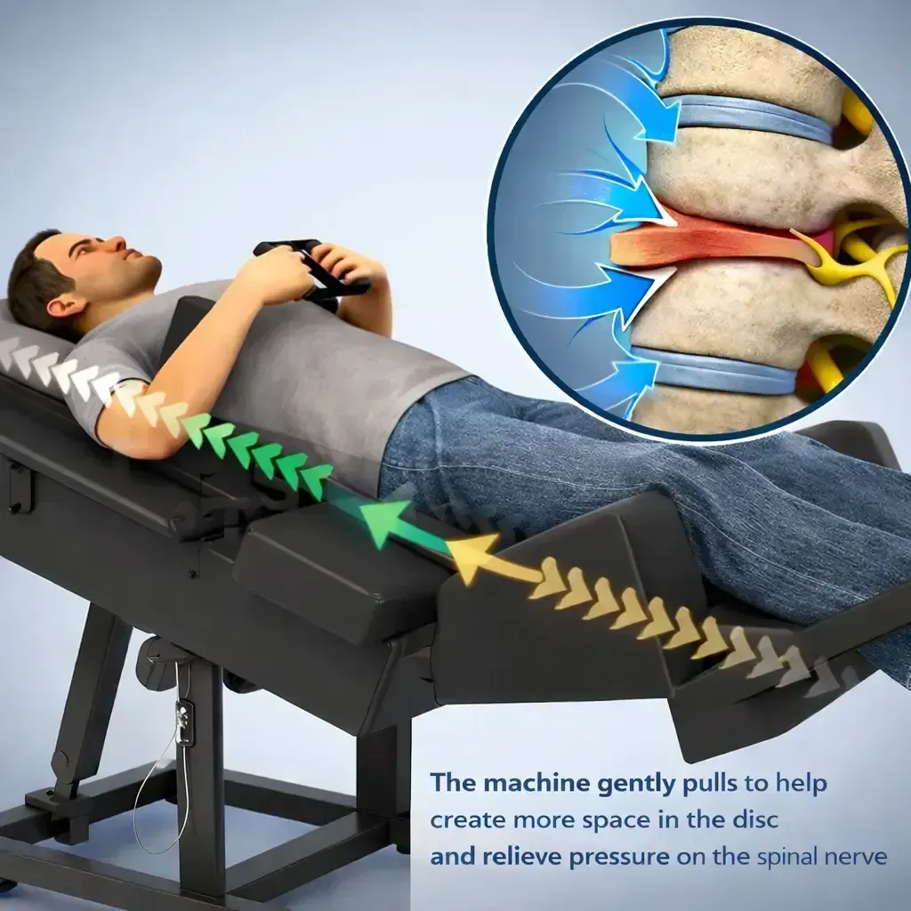 It works by gently pulling to create negative pressure within the disc, helping relieve pressure on the spinal nerve and encouraging bulging or herniated discs to move back toward their proper position.